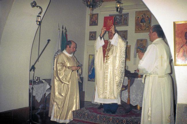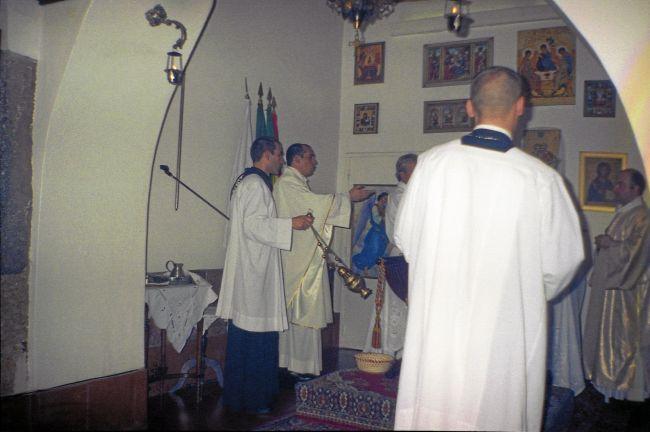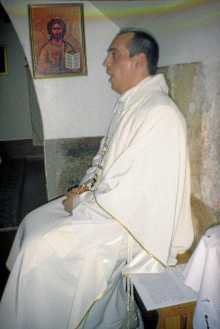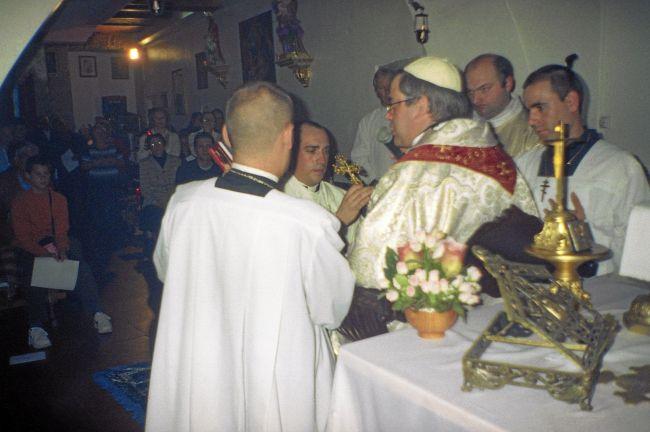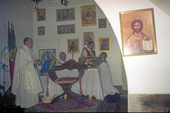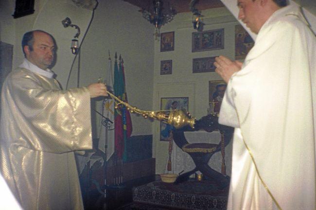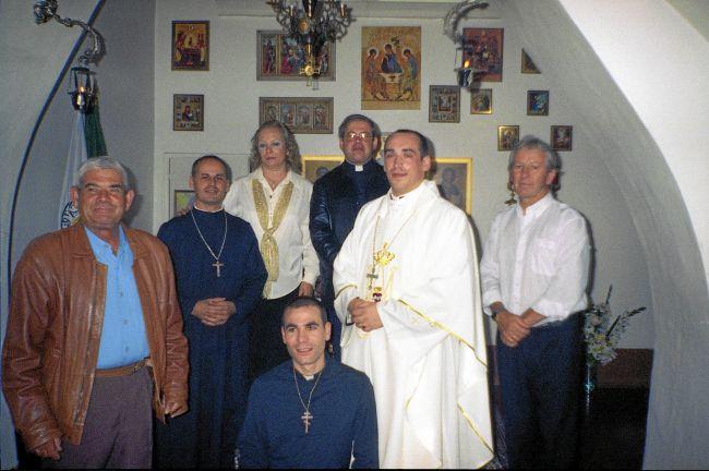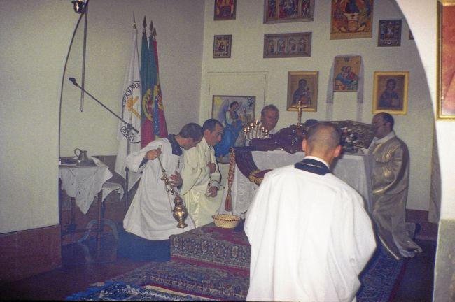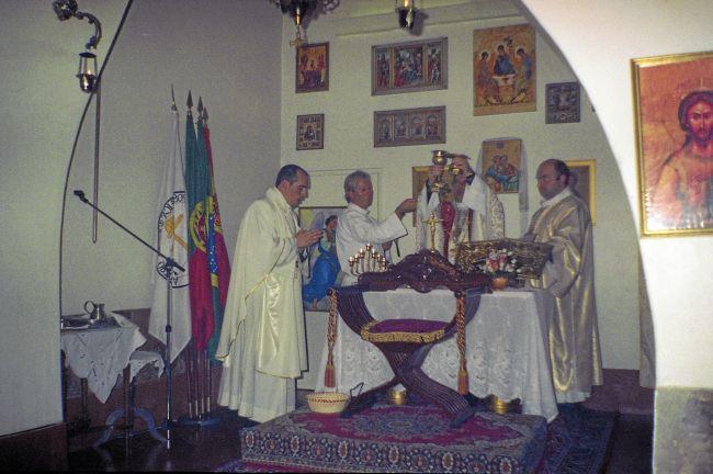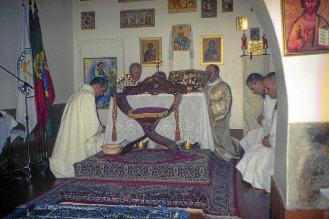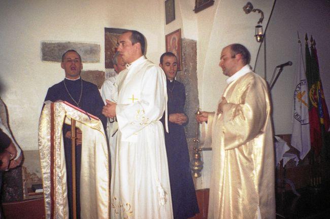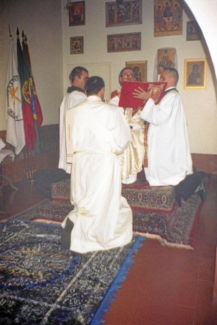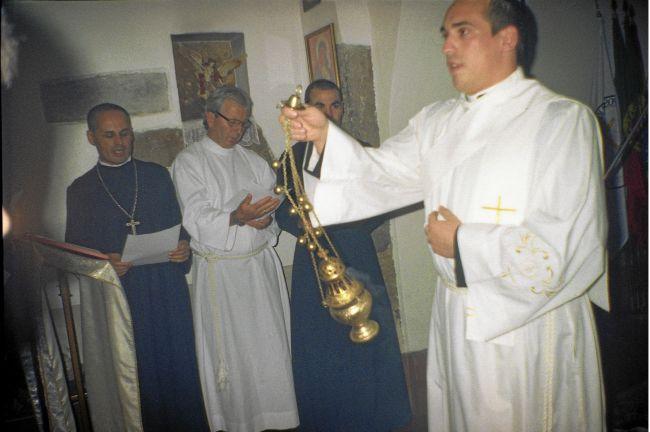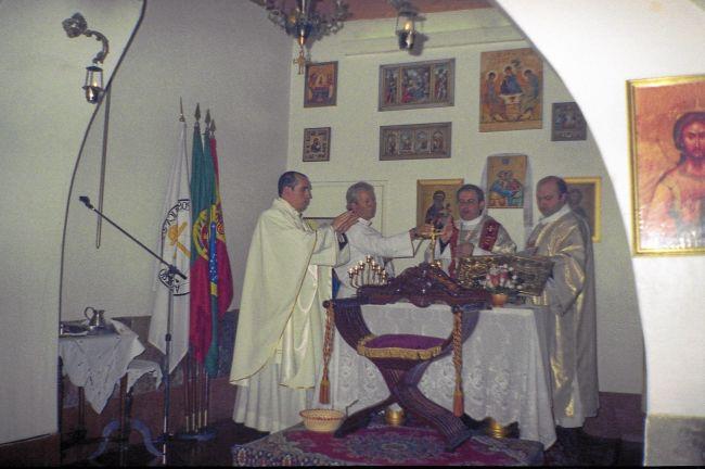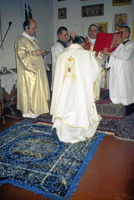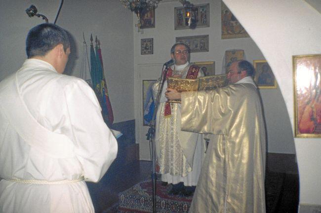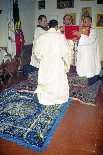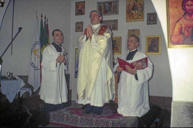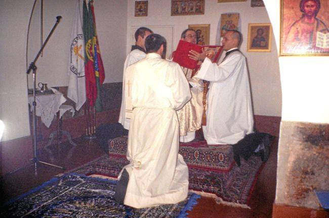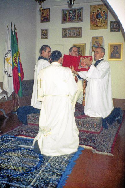 O eleito, Rev.do Pe. Humberto Jorge Pereira Rolo recebe do "Arcebispo" sr. Armando da Costa Monteiro a unção nas mãos, sob o olhar atento do então Rev.do Pe. Diácono Álvaro Duarte e do então Monge Rui Assunção