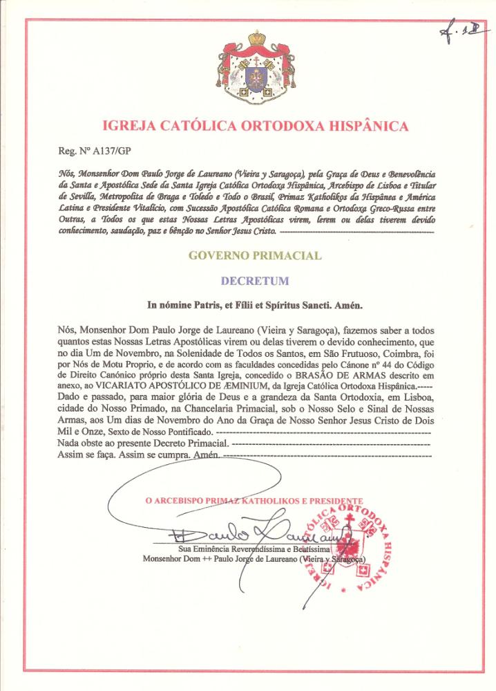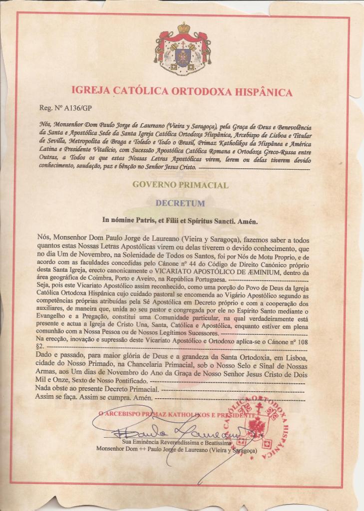 Nota: Em 10 de Agosto de 2014, é emitido o Oficio Primacial Nº 002/08/14/GP, após longa meditação e a consulta informal de alguns destacados membros da Igreja, entre clérigos e fiéis, acerca de todo o percurso do Vicariato Apostólico de Aeminium, sob a responsabilidade do Padre Humberto Jorge Pereira Rolo, especialmente constatando as situações que têm acontecido dentro da sua circunscrição ao longo do ano 2013-2014, assim como alguma persistência no abuso de autoridade em contradição com o direito, assim como o descaso demonstrado para com a Sé Apostólica da Hispânia e o seu Arcebispo Presidente.