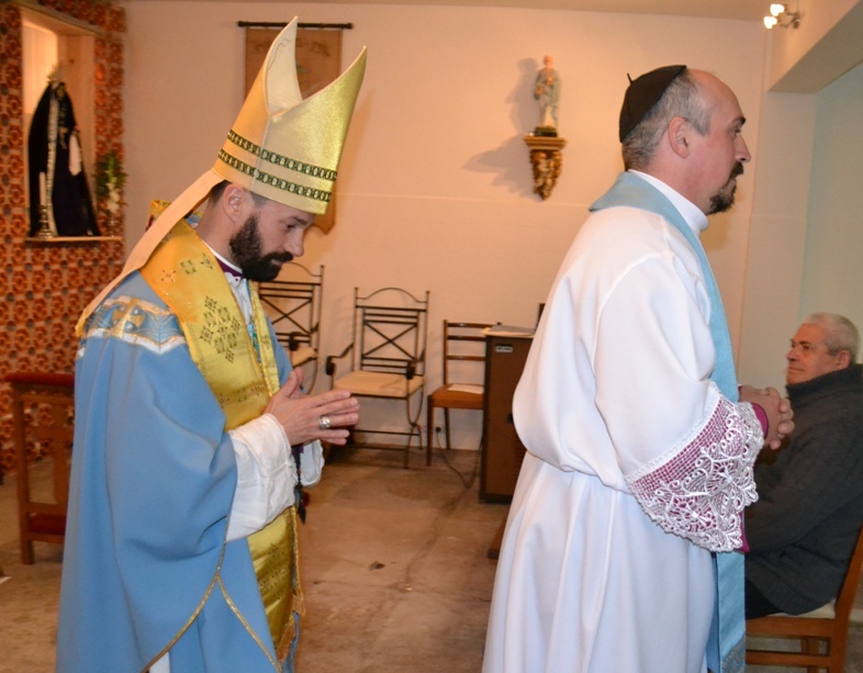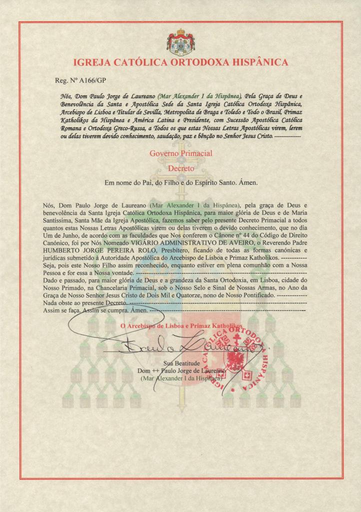 S.B. Dom Paulo Jorge de Laureano (Mar Alexander I da Hispânea), entrega ao Padre Humberto Jorge Pereira Rolo (André I da Hispânea) os Decretos da Erecção Canónica da Área Administrativa de Aveiro e da sua nomeação como Vigário Administrativo