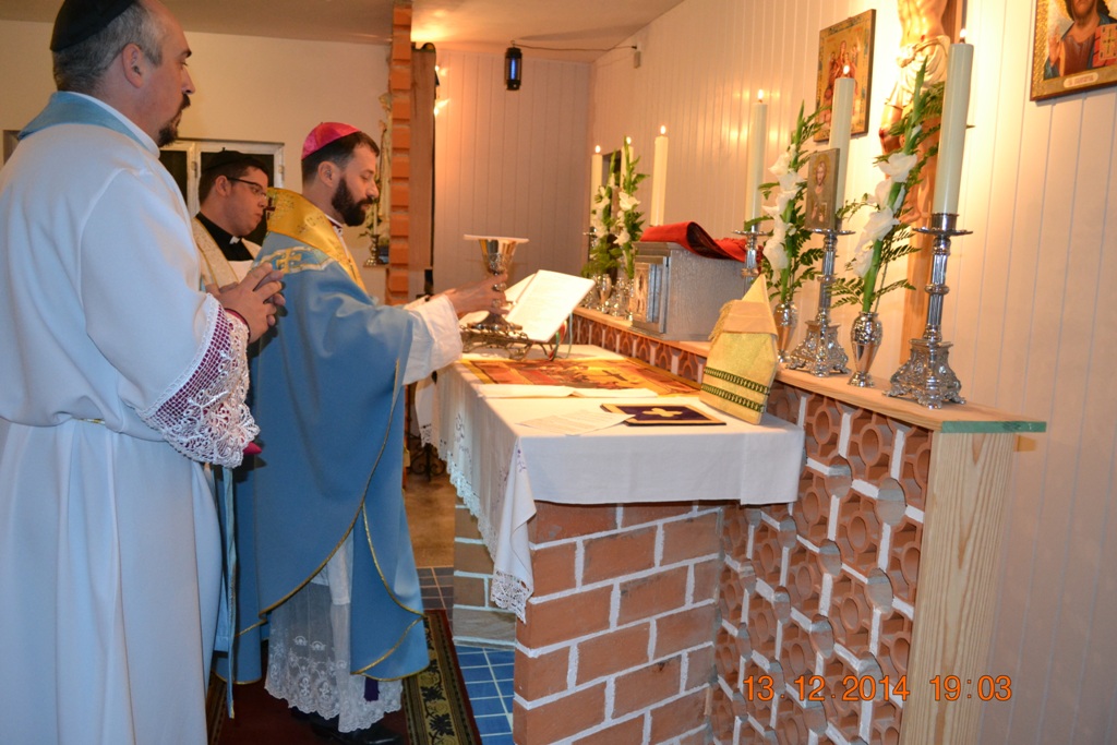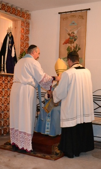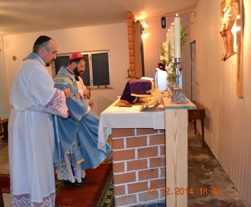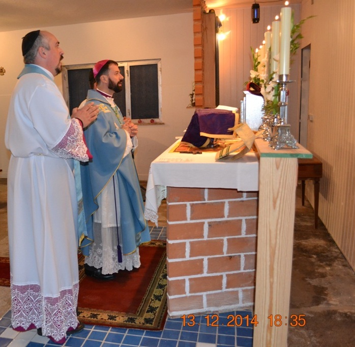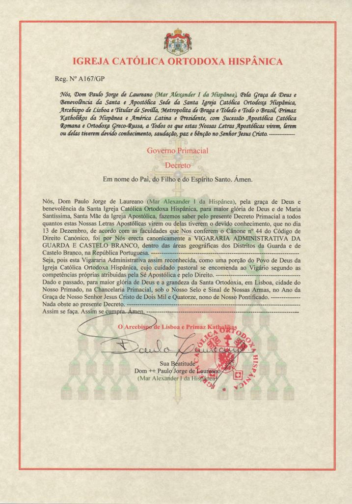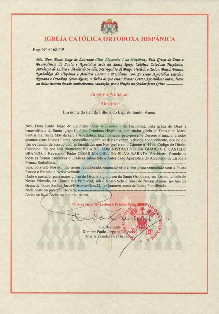 S.B. Dom Paulo Jorge de Laureano (Mar Alexander I da Hispânea), entrega ao Padre César Manuel da Silva Barata, os Decretos da Erecção Canónica da Área Administrativa da Guarda e Castelo Branco, da sua nomeação como Vigário Administrativo, e da sua Instituição como Exorcista