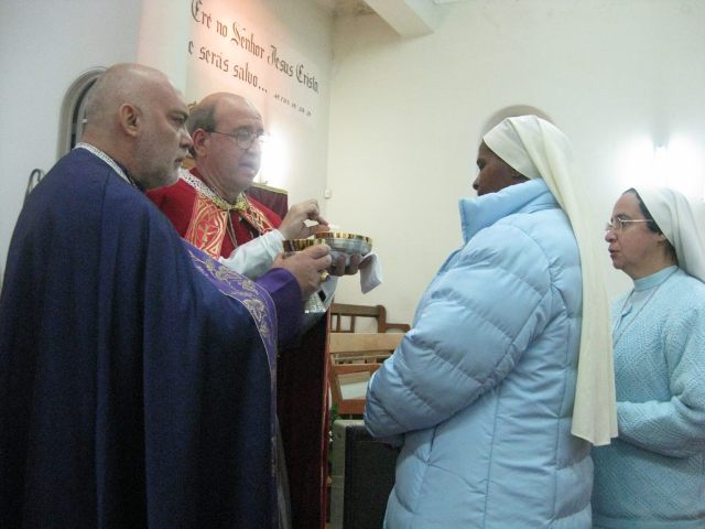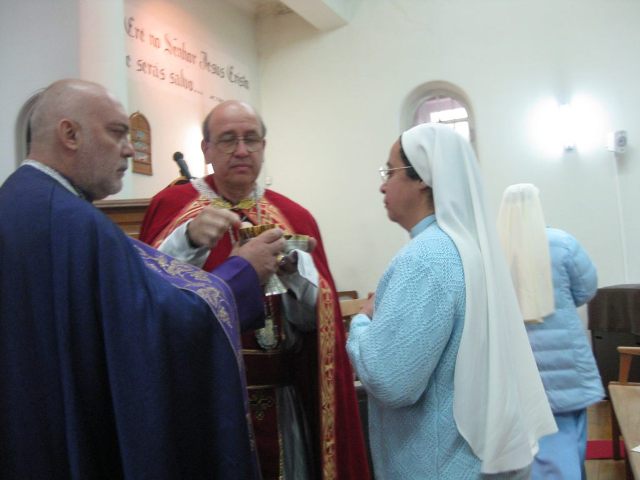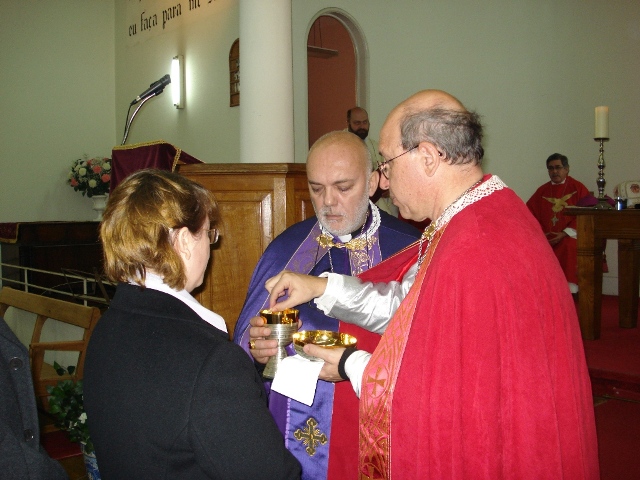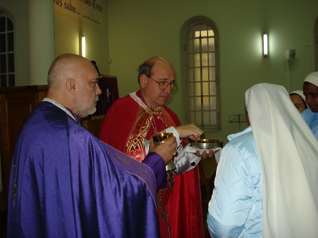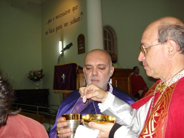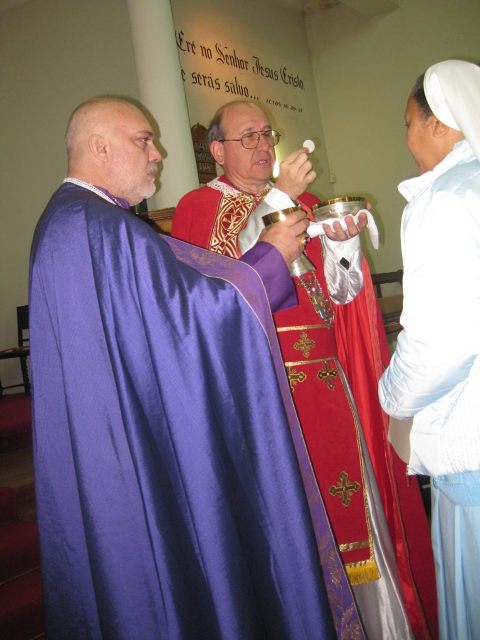 Consagrante e Consagrado distribuindo o Sagrado Corpo e o Preciosíssimo Sangue de Nosso Senhor Jesus Cristo