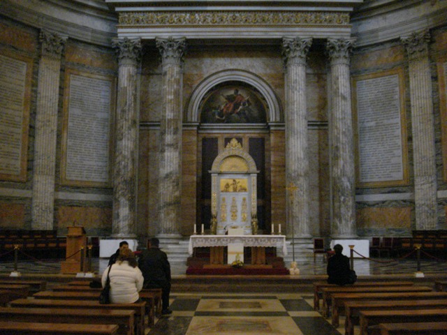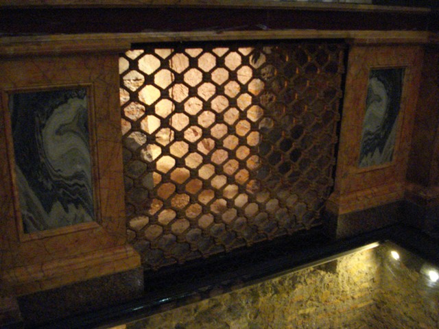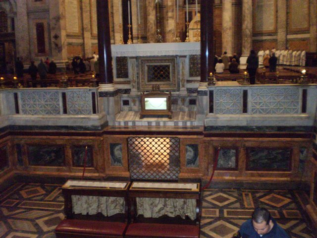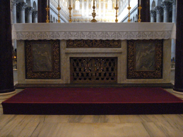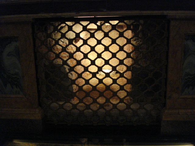 Sagrado Lugar onde na parte superior vê-se o lado do sepulcro grosseiro que segundo a Igreja Católica Apostólica Romana encerra os despojos mortais do Apóstolo Paulo