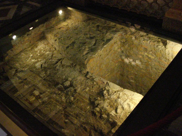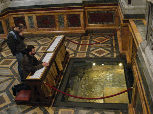 Por baixo da chapa transparente, pode ver-se o muro da abside do primeiro edifício da Basílica de Constantino (orientado em sentido inverso ao edifício actual)