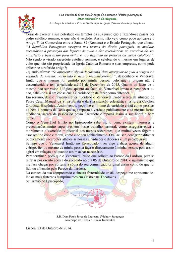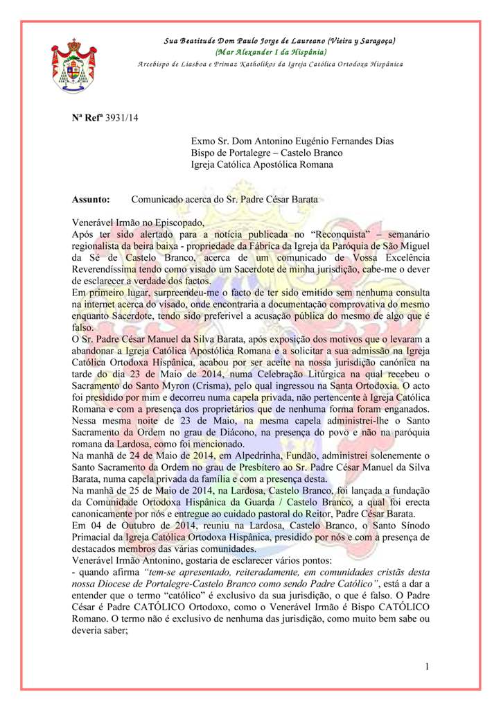Ao termos conhecimento do comunidado diocesano emitido por S. Exª Rev.ma D. Antonino Eugénio Fernandes Dias, bispo católico romano de Portalegre - Castelo Branco, com data de 20 de Outubro de 2014, e publicado no Jornal “Reconquista” – semanário regionalista da beira baixa - propriedade da Fábrica da Igreja da Paróquia de São Miguel da Sé de Castelo Branco, no qual é colocada em causa a honra e o bom nome do Rev.do Pe. César Manuel da Silva Barata, presbítero desta Jurisdição Canónica, prontamente escrevemos ao referido prelado repondo a verdade.