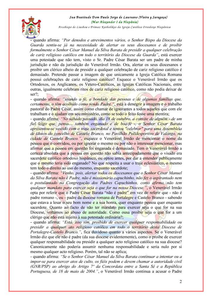Ao afirmar: “Por denodos e atrevimentos vários, o Senhor Bispo da Diocese da Guarda sentiu-se já na necessidade de alertar os seus diocesanos e de proibir formalmente o Senhor César Manuel da Silva Barata de presidir a qualquer celebração de cariz religioso católico em todo o território da Diocese da Guarda”, vêmos a tentativa de exercício ilícito da potestade episcopal da parte de S. Exª Rev.ma D. Manuel da Rocha Felícia, prelado romano da Guarda. Imaginamos que esta é a origem do comunicado diocesano de S. Exª Rev.ma D. Antonino Dias, instigado satanicamente pelo seu irmão no episcopado, que se encontra mais preocupado em acusar e denegrir os sacerdotes alheios, mas protegendo na sua diocese sacerdotes condenados pela justiça por actos que carecem de religiosidade.