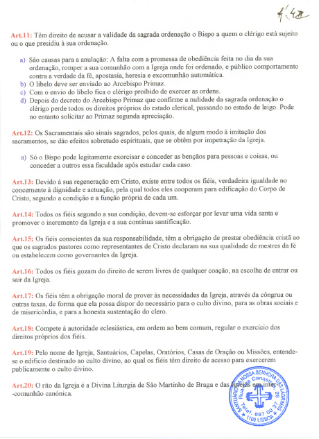 Analisando o regulamento canónico da anterior comunidade eclesial a que pertenceu o Senhor Padre Humberto, e que foi aprovado pelo "santo sínodo" e promulgado pelo arcebispo primaz em 15 de Abril de 2001, afirma-se o seguinte: “Mediante o Sacramento da Ordem por instituição divina, alguns dos fiéis, pelo carácter indelével com que se assinalam, são constituídos ministros sagrados, isto é, são consagrados e deputados para que, segundo o grau de cada um, apascentem o povo de Deus, desempenhando na pessoa de Cristo as funções de ensinar, santificar e reger...”. Ora, pelo que é referido anteriormente, vemos que não tem qualquer efeito válido e muito menos canónico o artº 11, a) do mesmo regulamento, que diz: “São causas para a anulação: a falta de obediência, digo, com a promessa de obediência feita no dia da sua ordenação, romper a sua comunhão com a Igreja onde foi ordenado, e publico comportamento contra a verdade da fé, apostasia, heresia e excomunhão automática.” e a alínea d) que diz: “Depois do decreto do Arcebispo Primaz que confirme a nulidade da sagrada ordenação o clérigo perde todos os direitos próprios do estado clerical, passando ao estado de leigo...”.