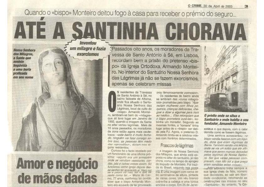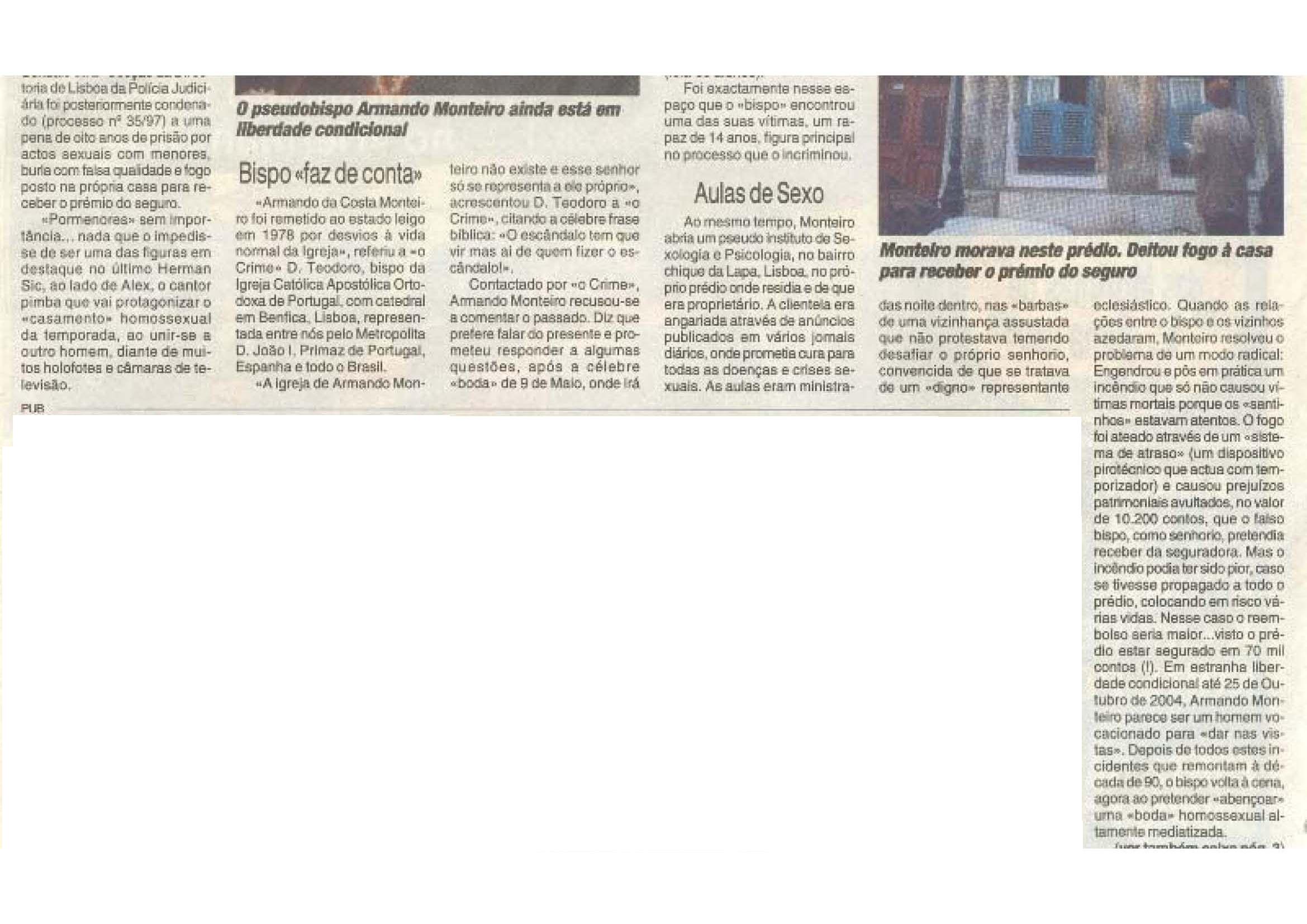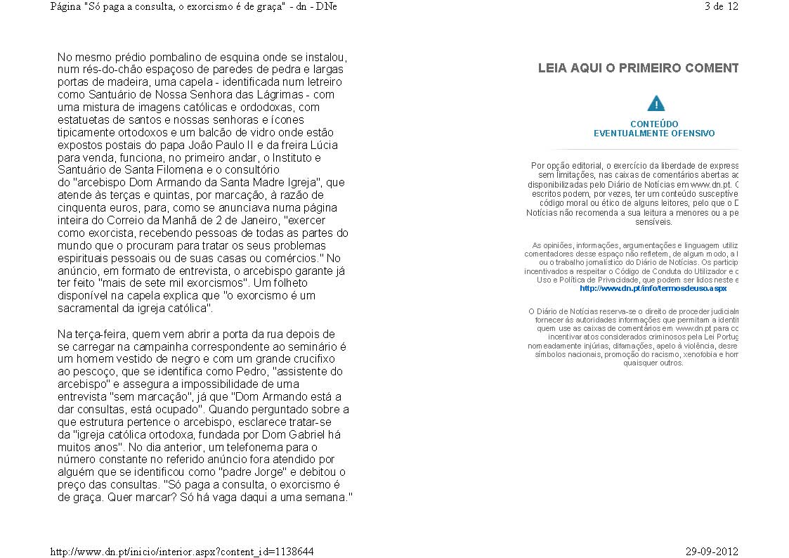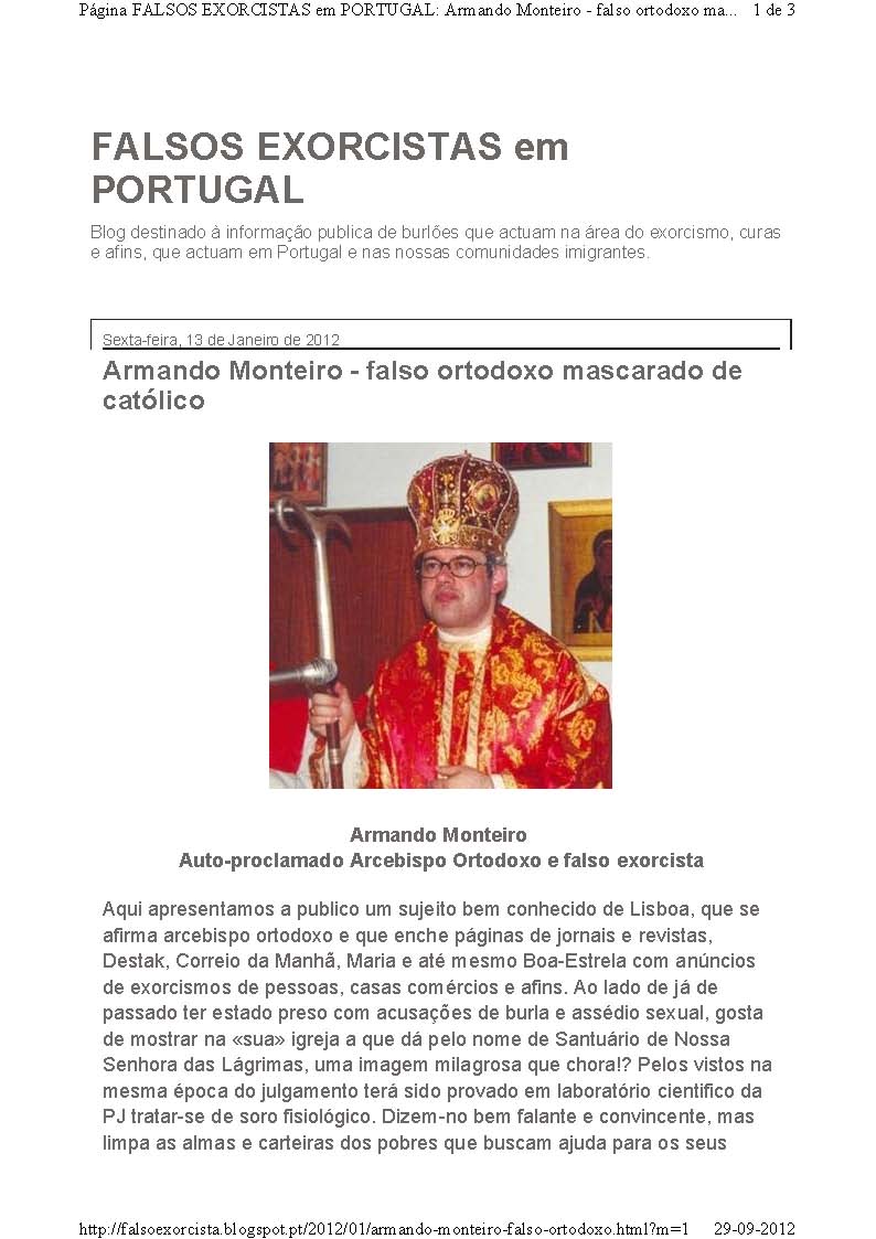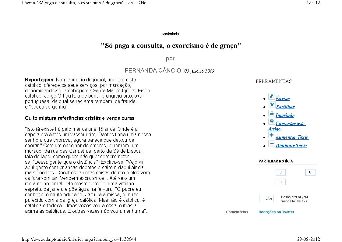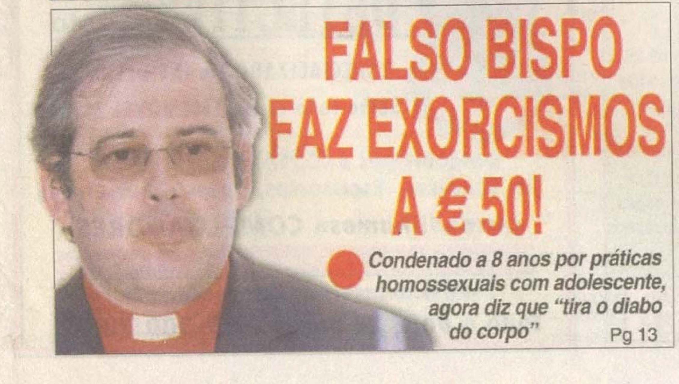 «Num anúncio de jornal, um 'exorcista católico' oferece os seus serviços, por marcação, denominando-se 'arcebispo da Santa Madre Igreja'. Bispo católico, Jorge Ortiga fala de burla, e a igreja ortodoxa portuguesa, da qual se reclama também, de fraude e "pouca vergonha" (...)»