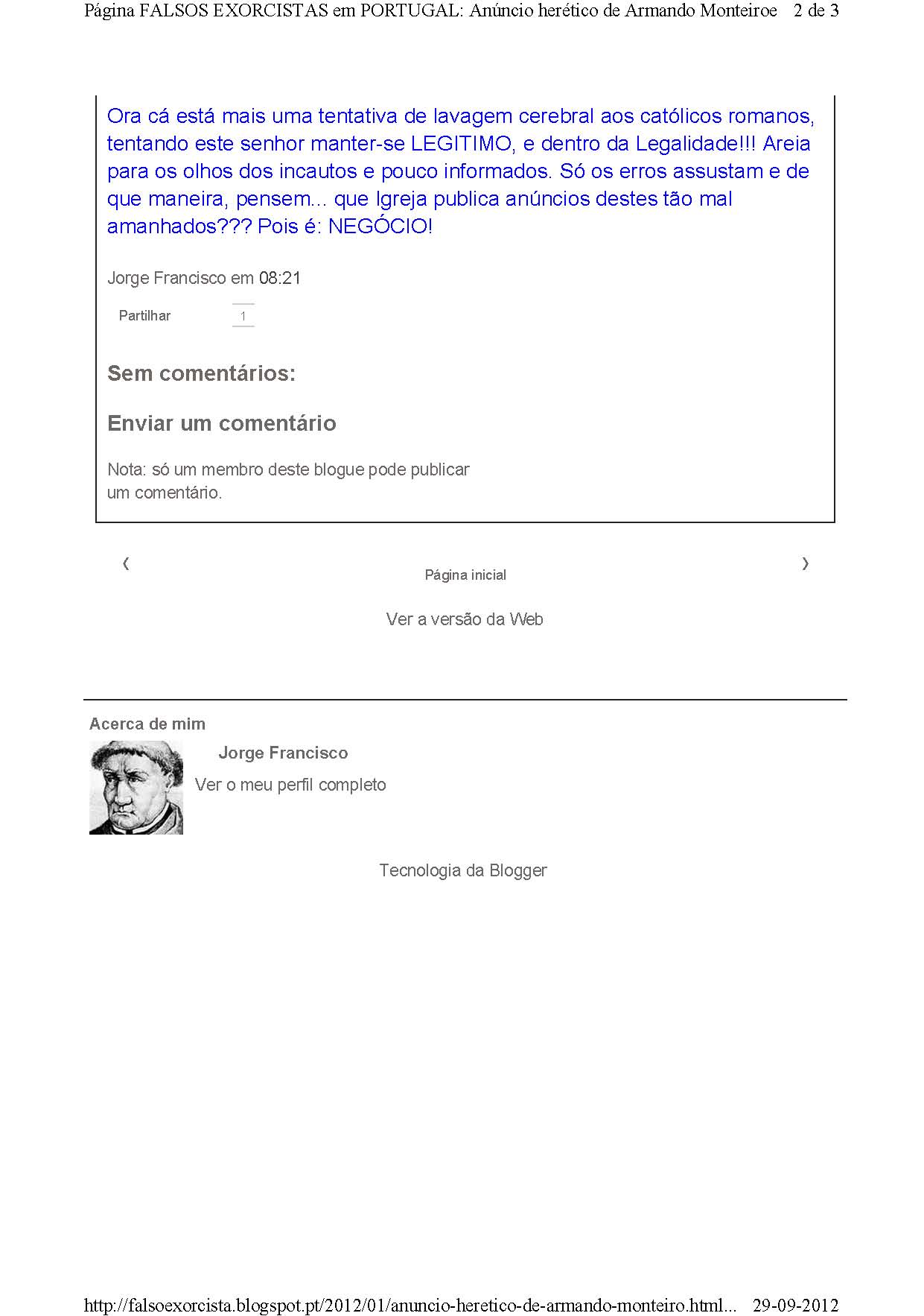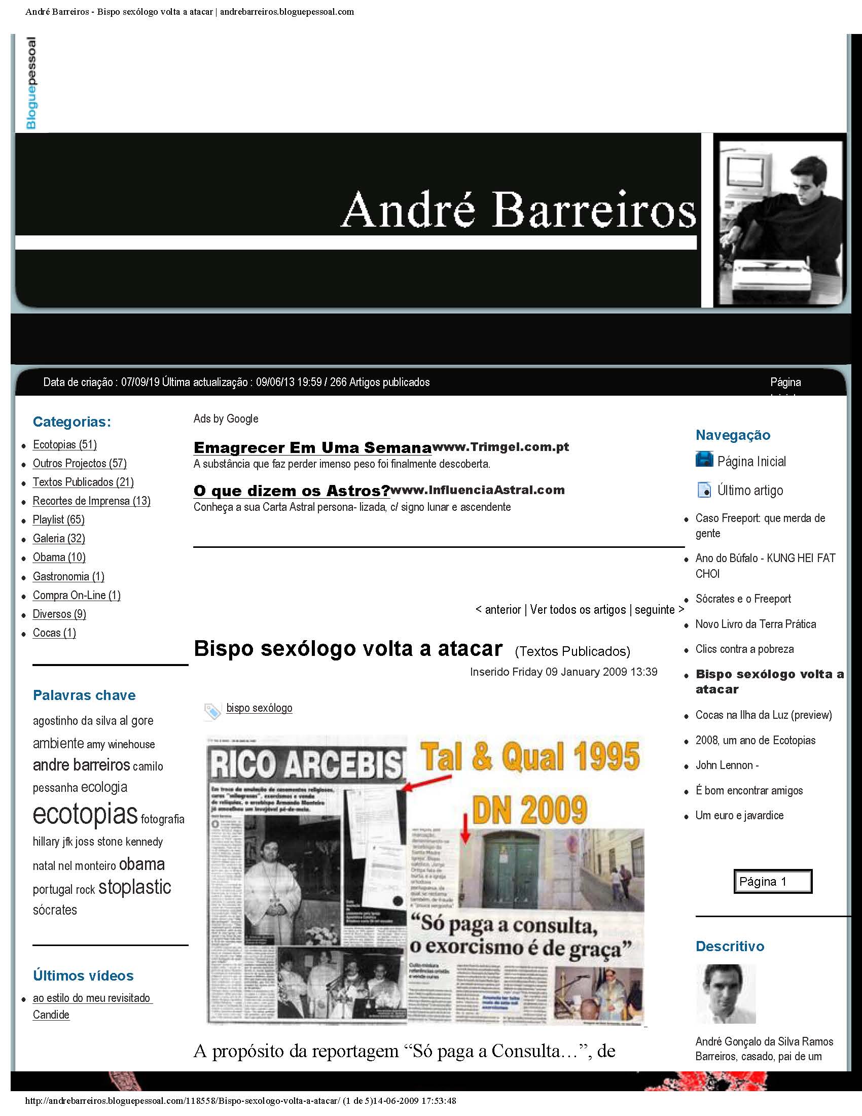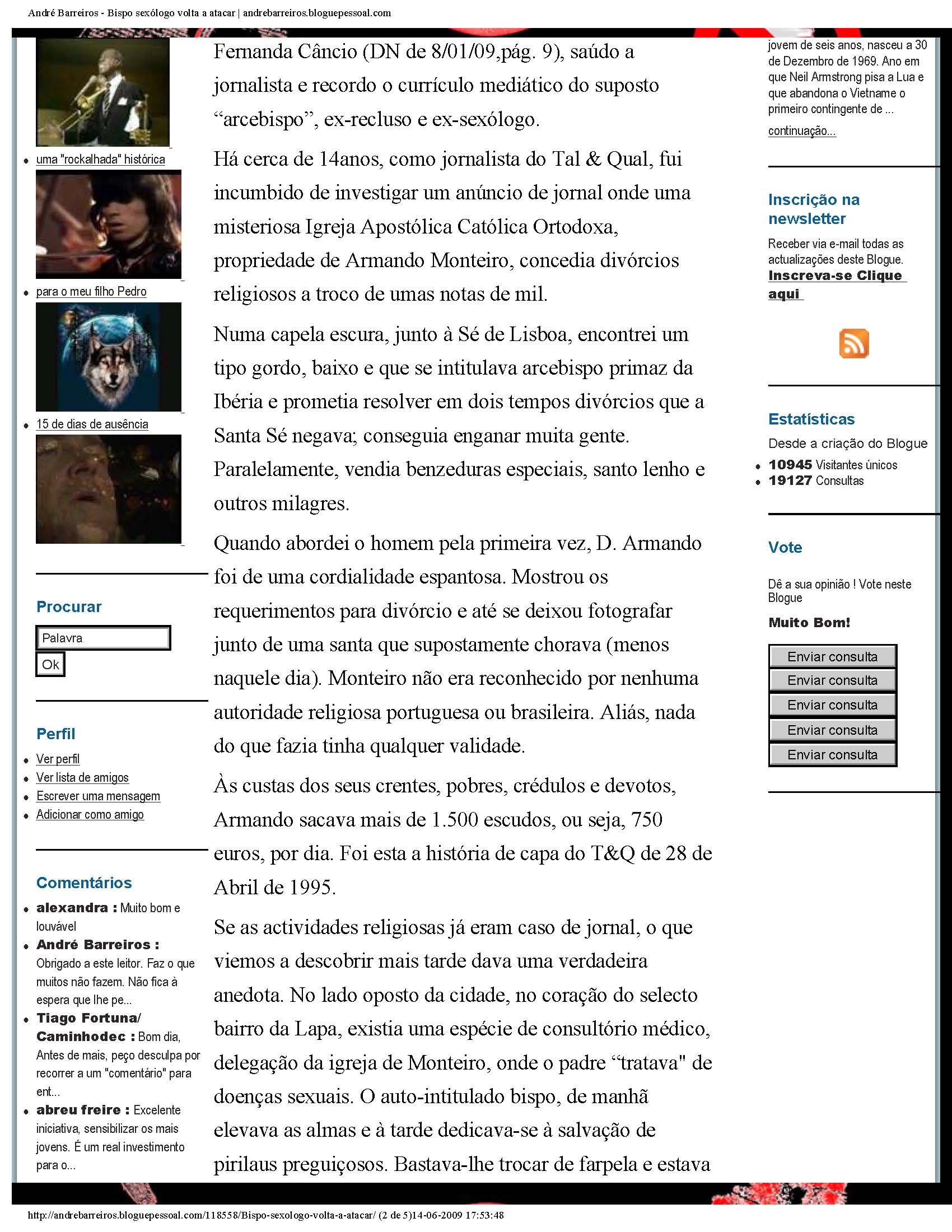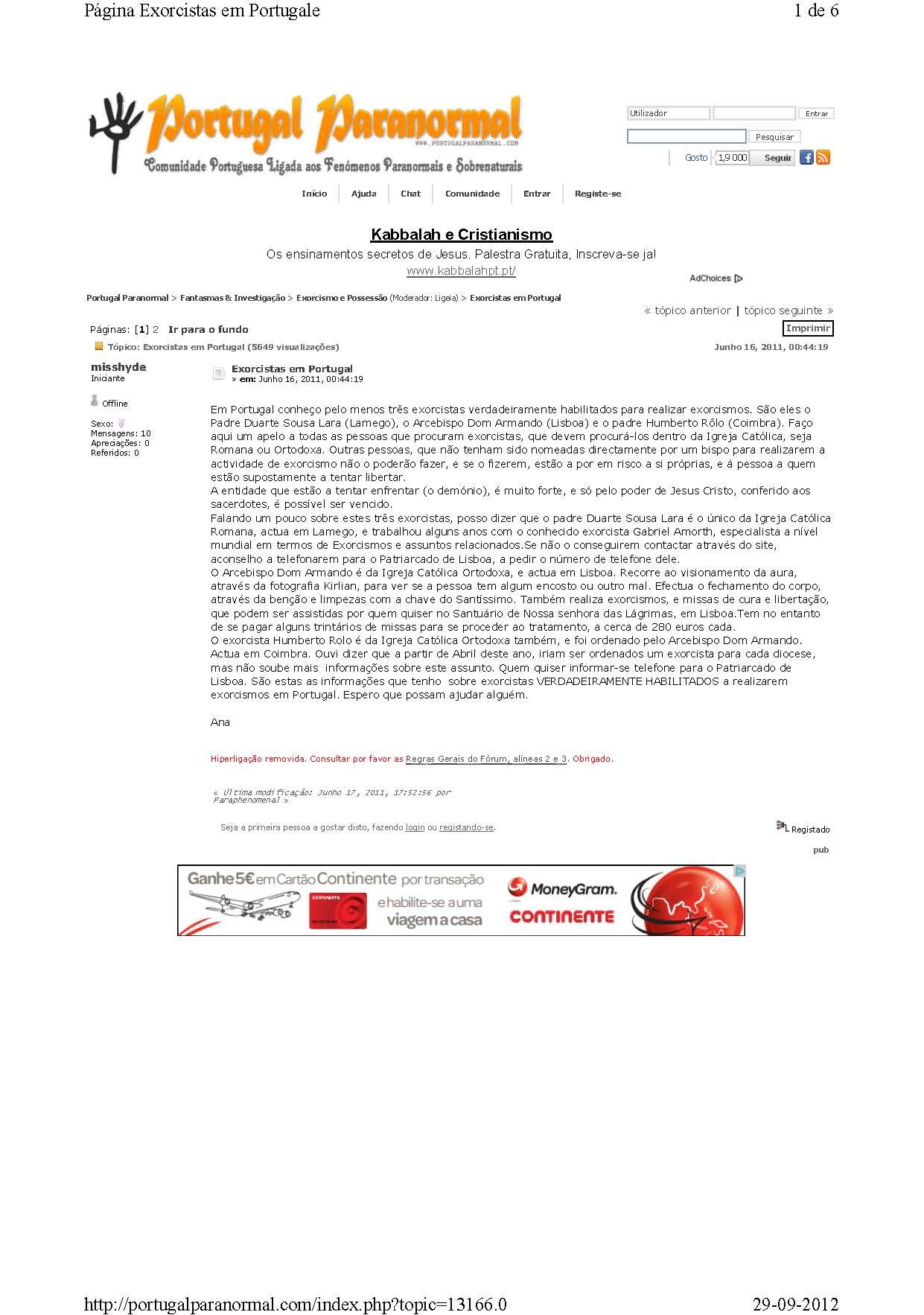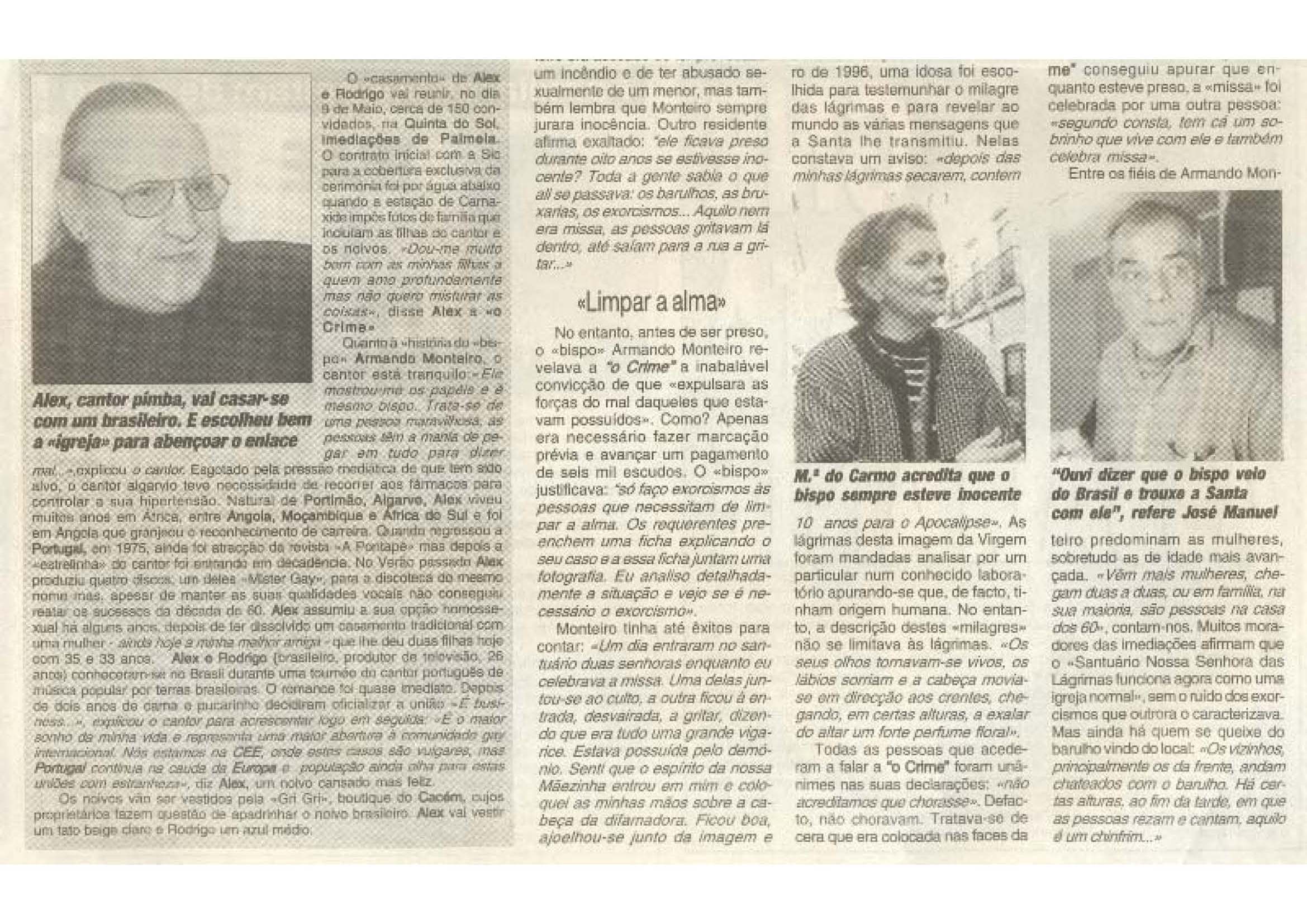 «Num anúncio de jornal, um 'exorcista católico' oferece os seus serviços, por marcação, denominando-se 'arcebispo da Santa Madre Igreja'. Bispo católico, Jorge Ortiga fala de burla, e a igreja ortodoxa portuguesa, da qual se reclama também, de fraude e "pouca vergonha" (...)»