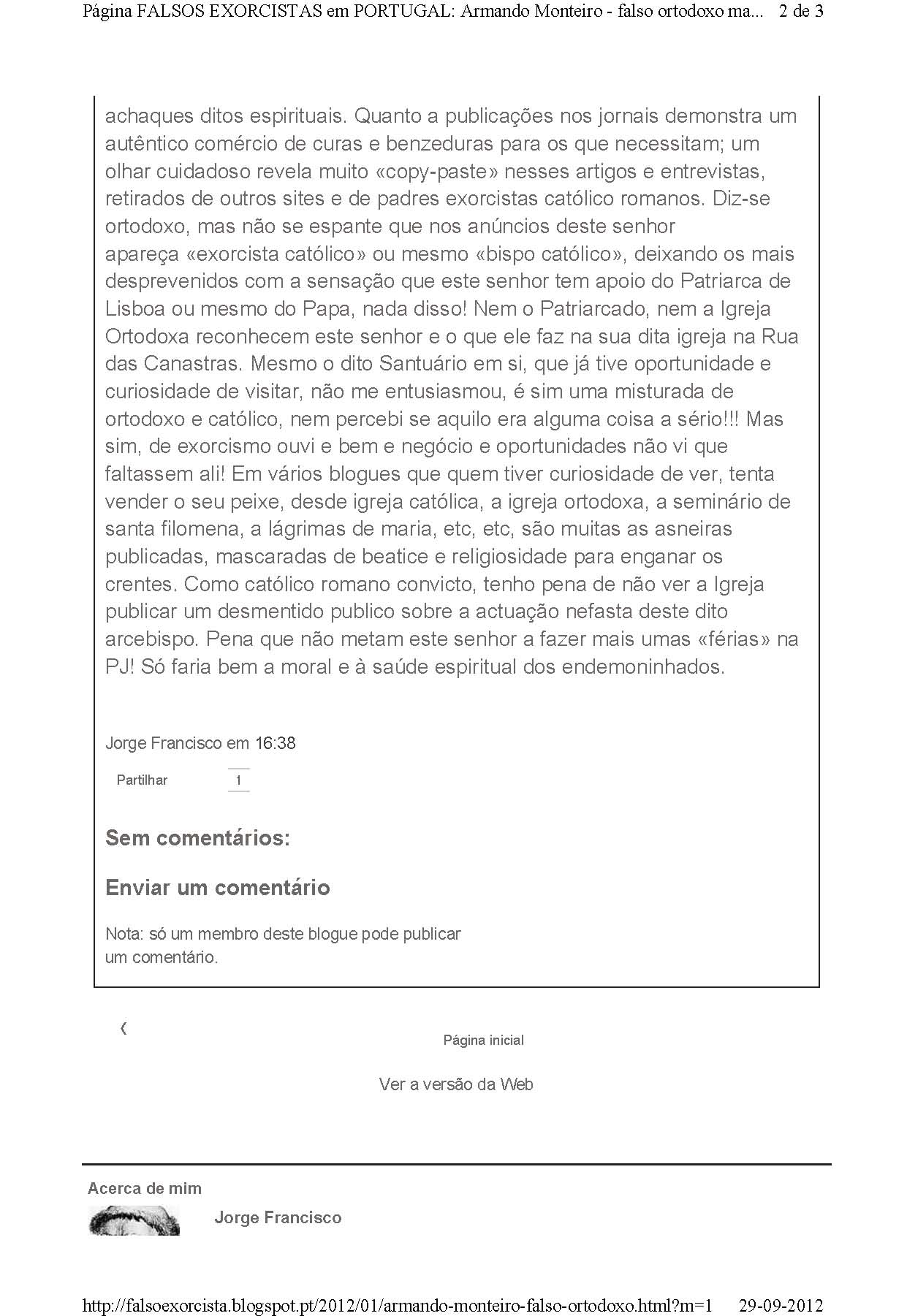 "... O Padre Alexandre Bonito, representante da Igreja Ortodoxa Grega em Portugal, contesta a existência da "Igreja Apostólica Católica Ortodoxa" como culto religioso, considerando que se trata de uma pura invenção de Armando Monteiro. (...) É uma mera associação criada pelo mero fundador, e pouco mais que isso. São quatro mentiras, nem é igreja, nem é católica, nem é apostólica, e muito menos ortodoxa. (...) ...adiantando que conheceu o "arcebispo" há anos, quan ele se intitulava sacristão da Igreja Católica, sem o ser. É um individuo que organizava excurções de velhinhas, a partir da Baixa da Banheira para a Santa da Ladeira. (...) Mais tarde, aparece no Brasil ligado ao D. Milton Cunha... Quanto aos alegados exorcismos, o padre Alexandre Bonito diz que tem sido contactado por pessoas que dizem ter sido "ludibriadas", como aconteceu o ano passado na Madeira, onde o "arcebispo" Monteiro foi dar consultas espirituais".