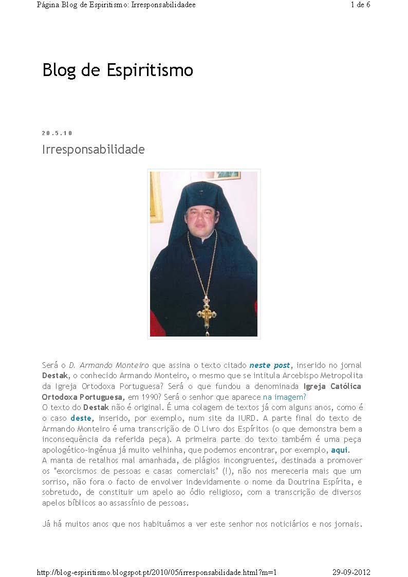 "Armando da Costa Monteiro..., foi corrido da genuína Igreja Ortodoxa Russa em 1978, mas o contratempo não lhe esmoreçeu a «fé», nem a tenacidade. Fundou a «sua própria capelinha» e pintou a mantá à custa da religião. (...) «Armando Monteiro foi remetido ao estado de leigo em 1978, por devios à vida normal da Igreja», referiu a «o Crime», D. Theodoro, bispo da Igreja Católica Apostólica Ortodoxa de Portugal, com Catedral em benfica, Lisboa, representada entre nós, pelo Metropolita D. João I, Primaz de Portugal, Espanha e Todo o Brasil. «A Igreja de Armando Monteiro não existe e esse senhor só se representa a ele próprio», acrescentou D. Theodoro...".