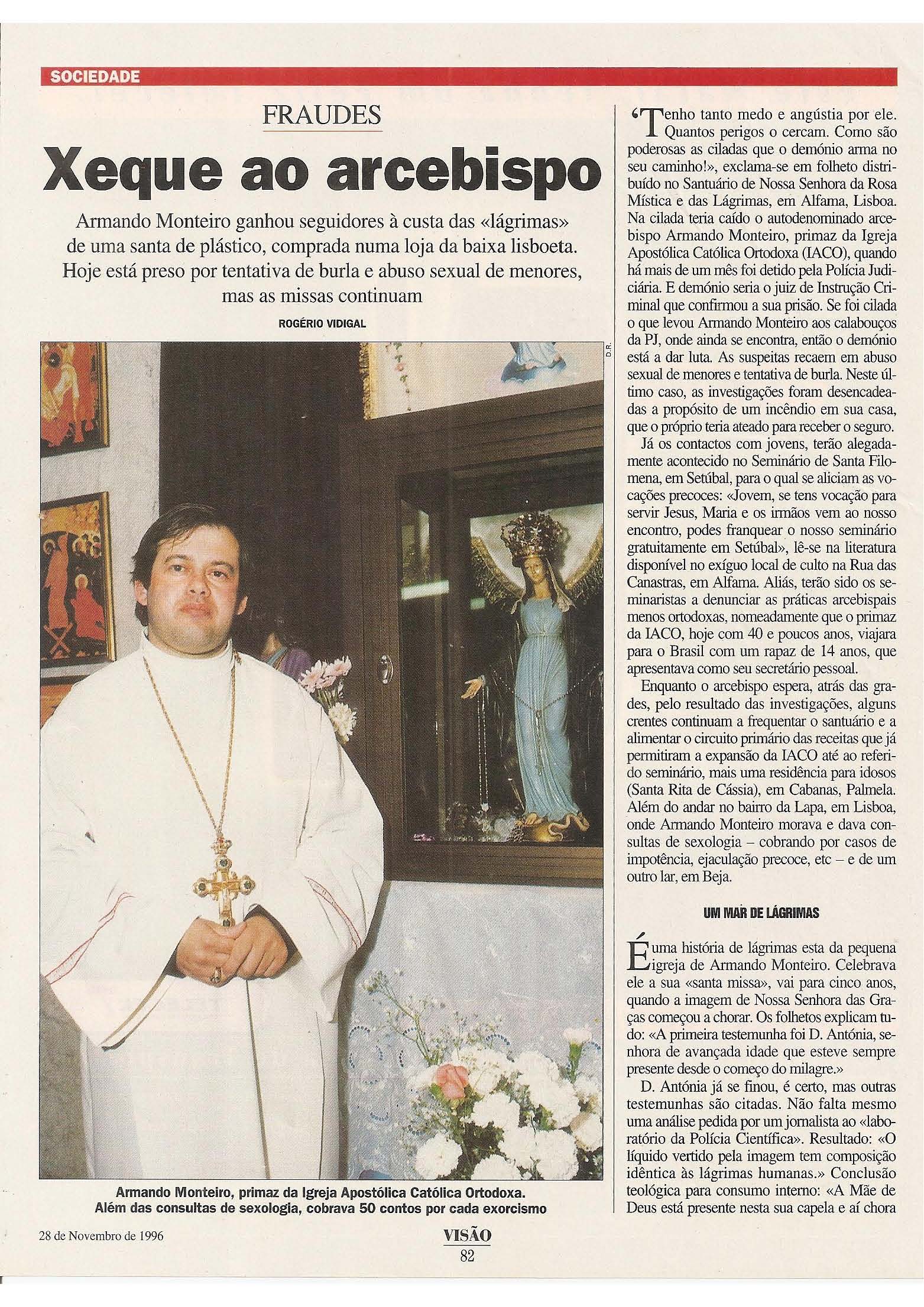 "Quem diz conhecê-lo, segue-lhe o percurso e toma cada notícia como mais um sinal de que o homem está em rota errada desde há muito tempo. O Arquimandrita José, da Igreja Católica Ortodoxa de Portugal (Igreja Autónoma de Portugal), não tem dúvidas em negar qualquer legítimidade à inicitiva de Armando Monteiro: «Somos os únicos ortodoxos em Portugal» (à data da reportagem). Deste ponto de vista ele não é nada. Diz que foi sagrado por um bispo que foi sagrado católico romano, o brasileiro D. Milton Cunha... (...) O pior, segundo elementos de um outro culto que mantêm ligações com D. Milton, é que o bispo brasileiro conta muitas razões de queixa. «Ele diz-se engado por Armando Monteiro em vários domínios». (...) O primaz não é um estranho para o Arquimandrita. No final dos anos 70, Armando Monteiro passou dois ou três meses como «aspirante de um dos nossos Mosteiros, em Sintra», recorda José. Mas a sua conduta pessoal não se coadunava com a nossa vida monástica. Chegou a abeirar-se das pessoas, procurando recolher assinaturas com vista à sua sagração episcopal. E chegou mesmo, nessa altura, a anunciar milagres. Por isso, D. João Gabriel, aconselhou-o a procurar novas paragens.». E ele logrou a dica. (...) No Brasil, logrou, partindo de uma quarta classe, habilitar-se a graus académicos que lhe permitiram voltar a Portugal com vários cursos debaixo dos braços, um deles em sexologia. «Nós fomos investigar e não existe nenhum dos cursos que ele diz ter», formaliza o arquimandrita."