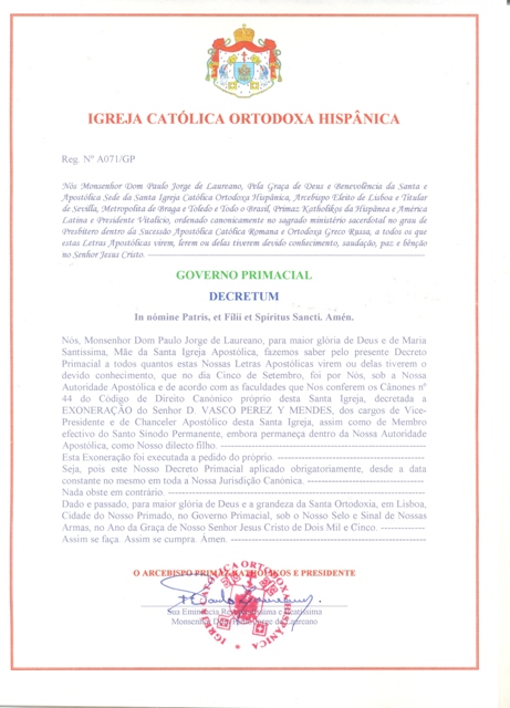 Exoneração do Sr. D. Vasco Perez y Mendes dos Cargos que tinha na Igreja - A071/GP