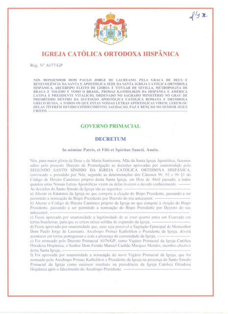 Promulgação das decisões do II Santo Sínodo Primacial da Igreja – A077/GP
