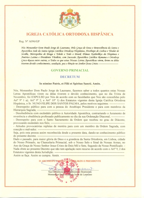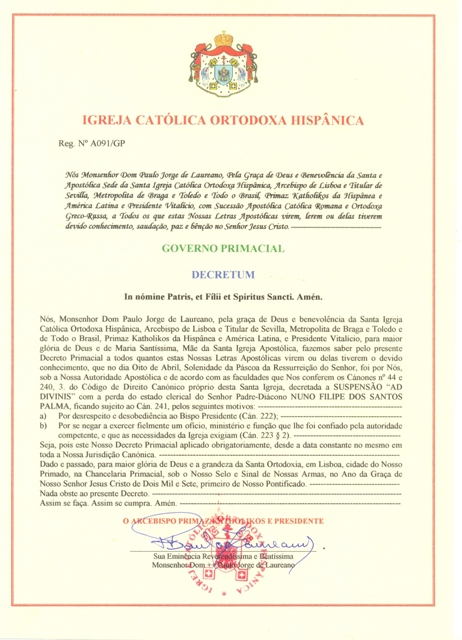 Suspensão “ad divinis” do Reverendo Padre-Diácono Nuno Palma – A091/GP