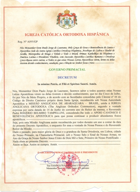 Apoio Canónico à Missão Anglicana de Araraquara – Brasil – A095/GP