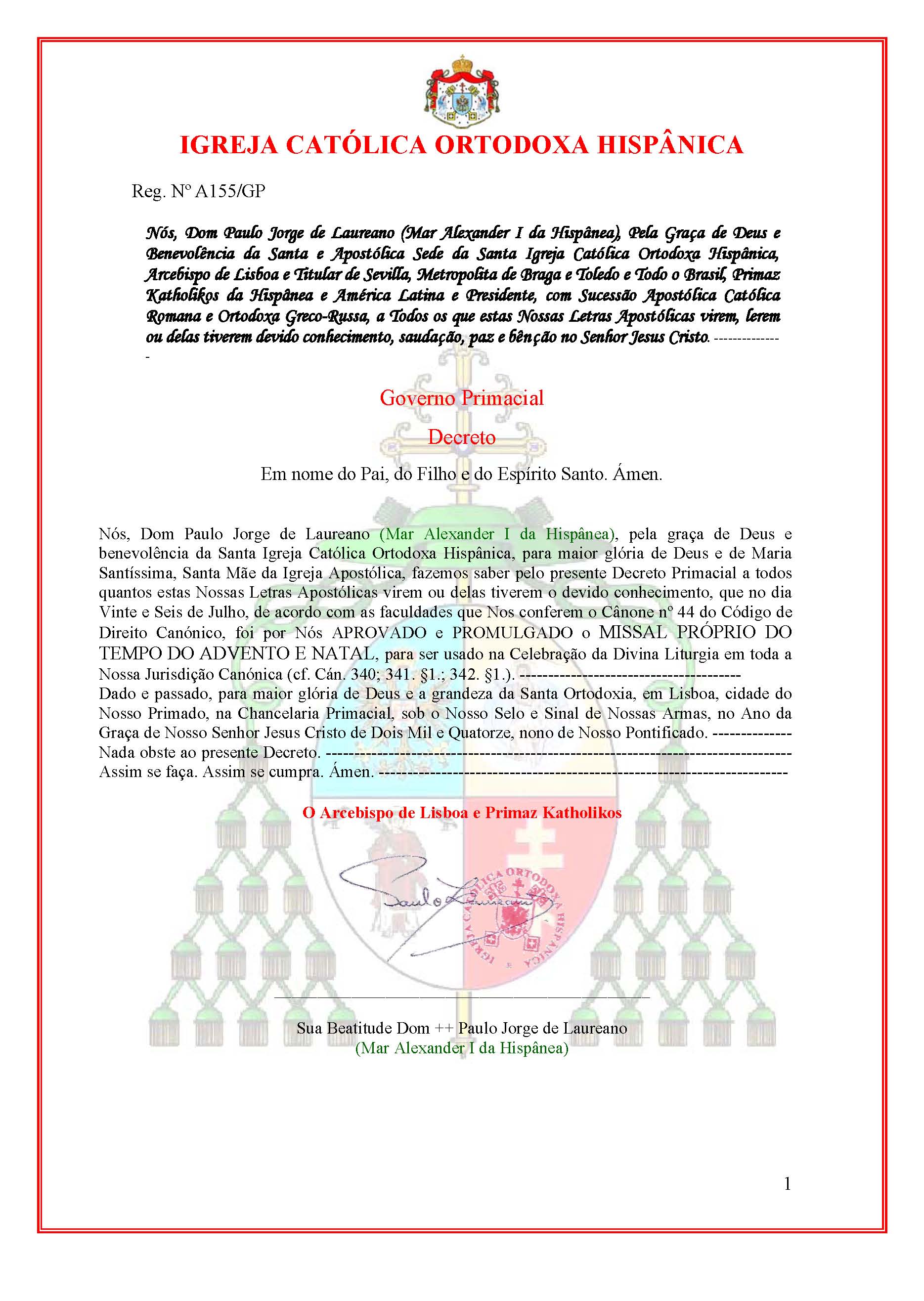 Promulgação do Missal Próprio do Tempo de Advento e Natal - A155/GP