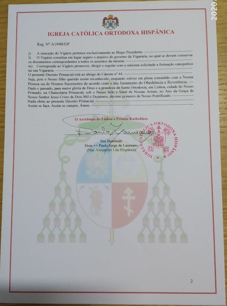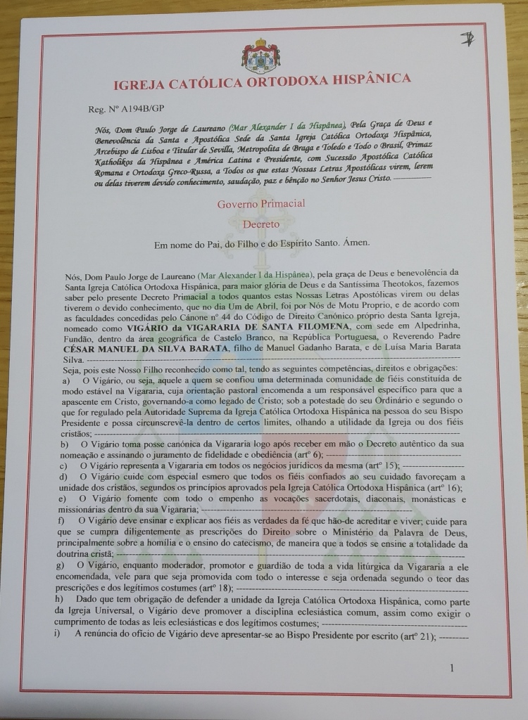 Nomeação do Hieromonge Humberto Rolo como Pároco de S. Jorge, S. Frutuoso, Coimbra - A186/GP