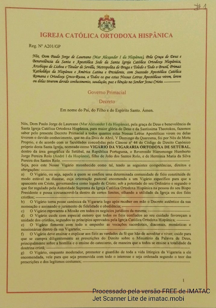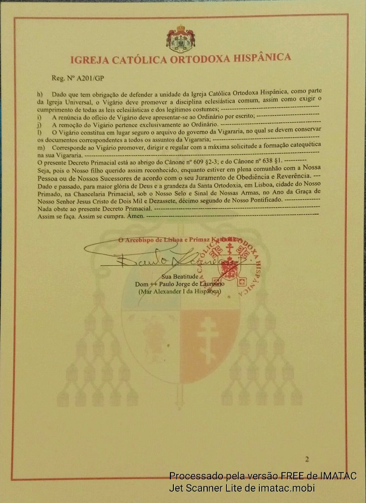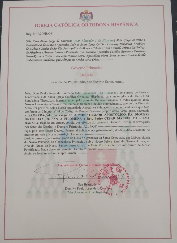 Exoneração do Pe. César Barata como Administrador Apostólico da Diocese Ortodoxa de Santa Filomena - A209B/GP