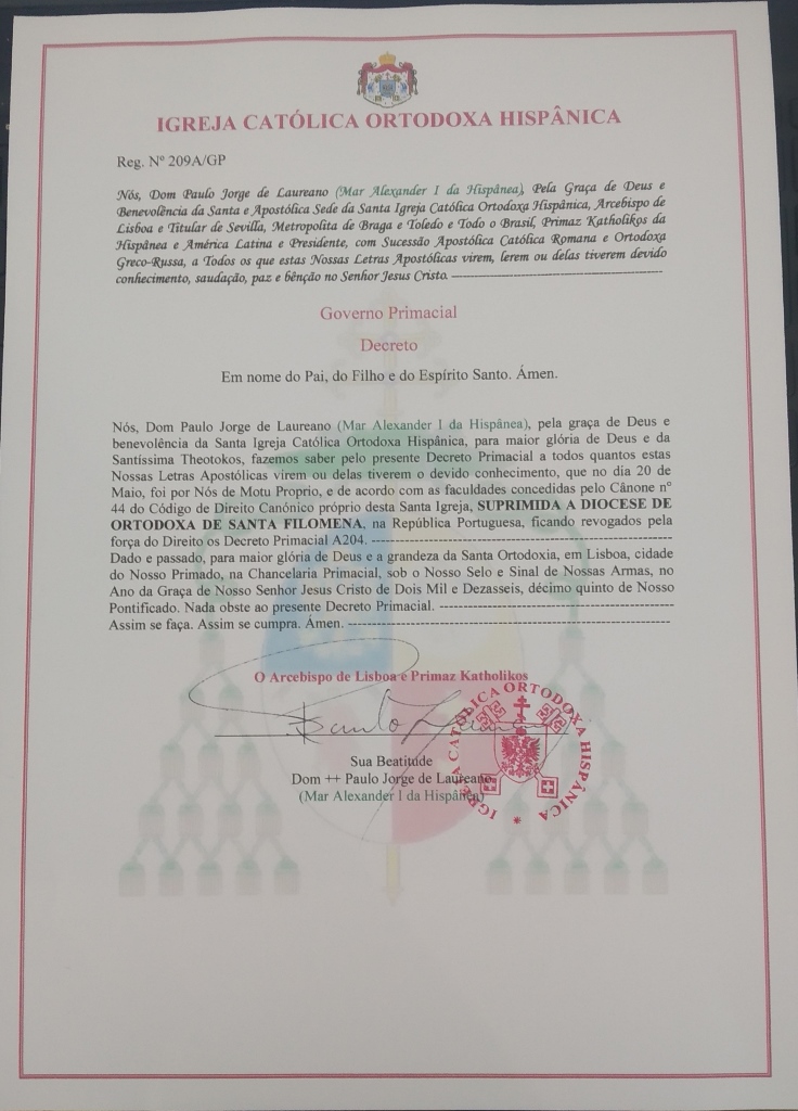 Supressão da Diocese Ortodoxa de Santa Filomena - A209A/GP