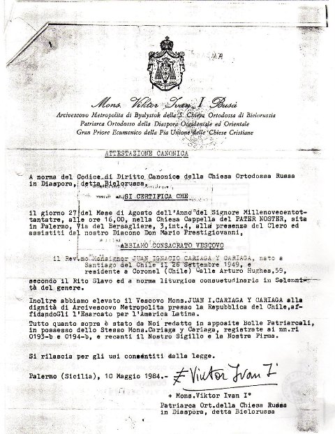 Bula de Reconhecimento da Sagração Episcopal por parte de S.B. Dom Juan Ignacio Cariaga y Cariaga
