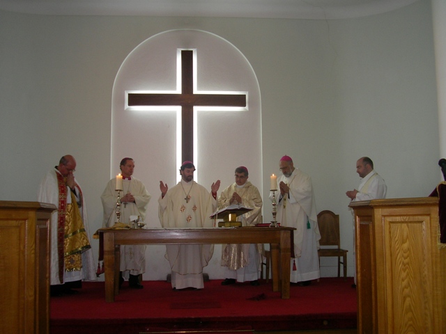 Concelebração Eucaristica com a presença de Dom Alfredo Mingolla-Montrezza (Mar Valerian de Silio), à esqª, Dom Delberto Araújo de Aguiar, S.B. Dom Paulo Jorge de Laureano (presidente), Dom Luis Reis Gonçalves, o Sr. Fernão Marques Gomes, e Mons. Álvaro José Miguel Gomes Duarte (12-04-2008)