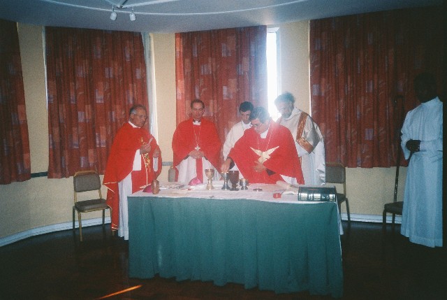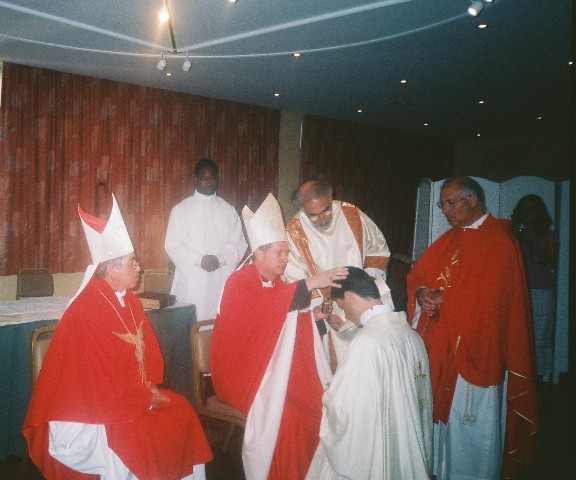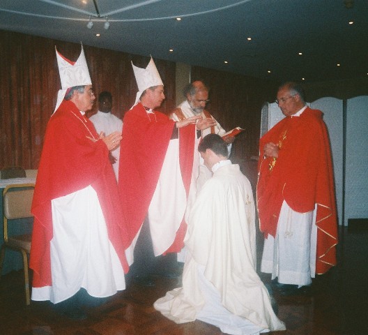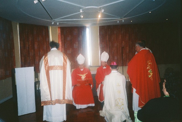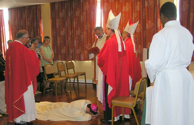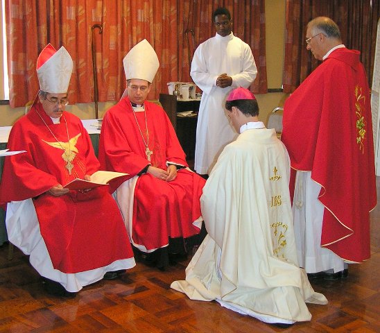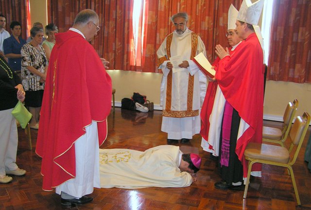 S.B. Dom Paulo Jorge de Laureano ajoelhado em frente aos Bispos Sagrantes, sendo ladeado pelo Reverendo Padre Amador de Sousa José