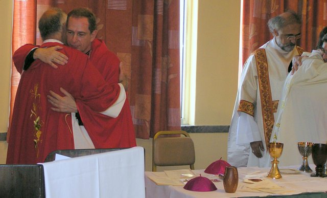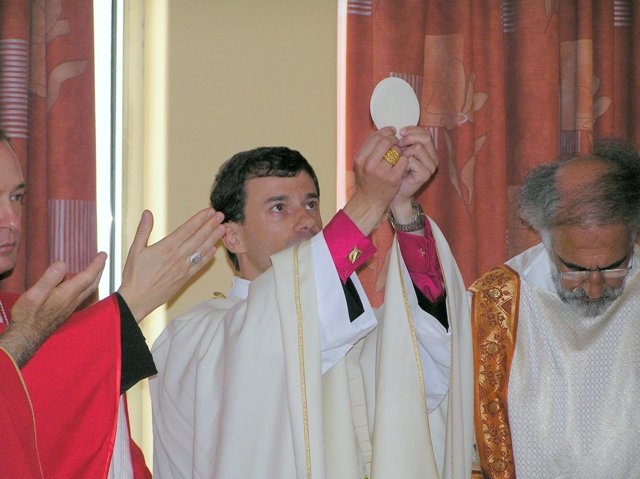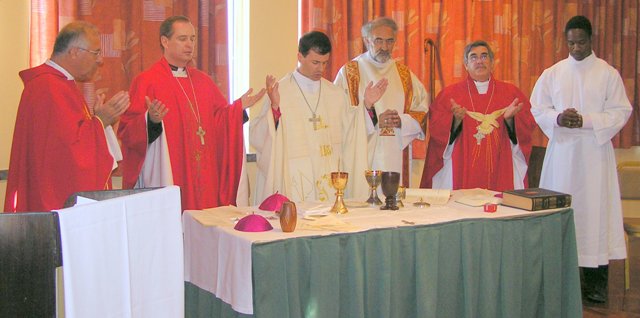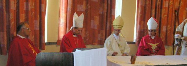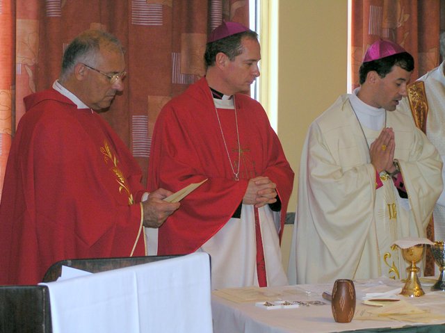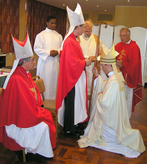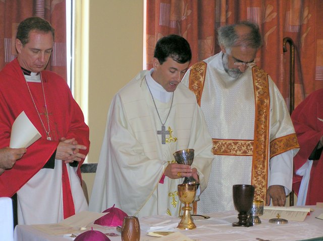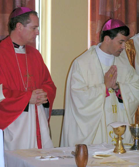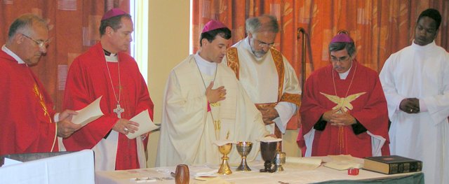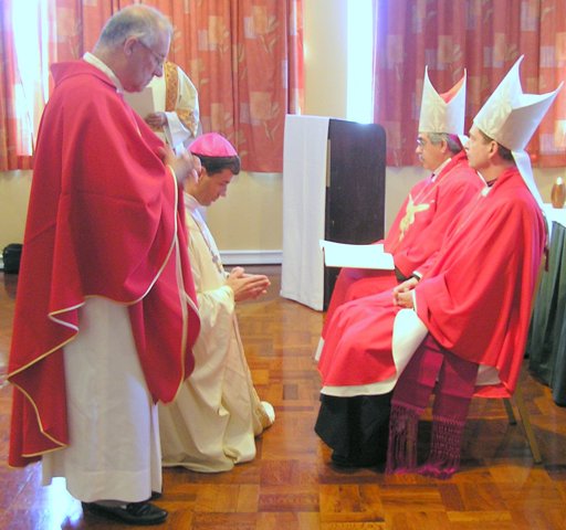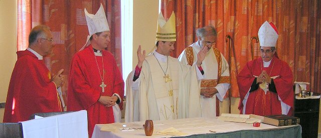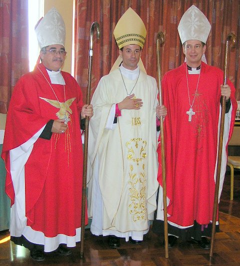 O Bispo ordenado ladeado pelos Bispos Sagrantes