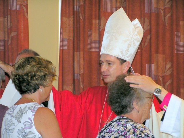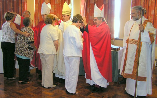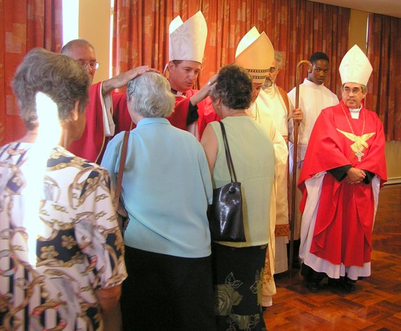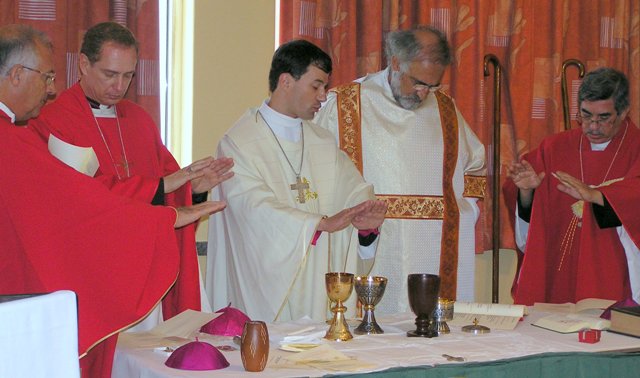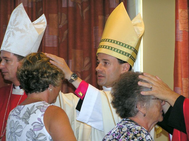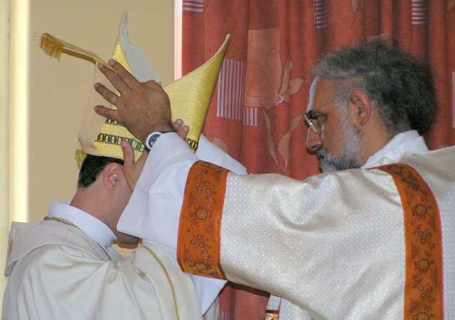 O Co-Consagrante impondo as mãos sobre a cabeça do Eleito