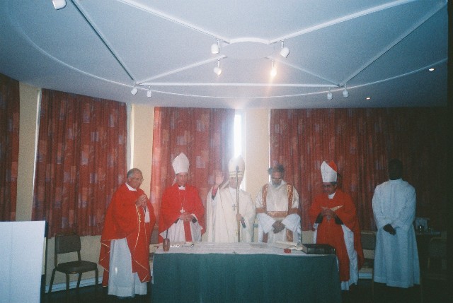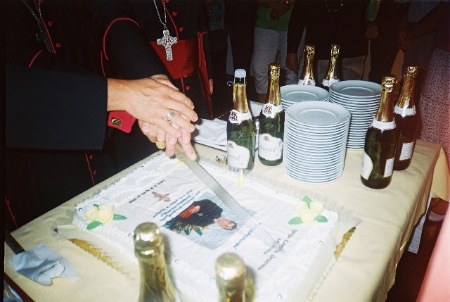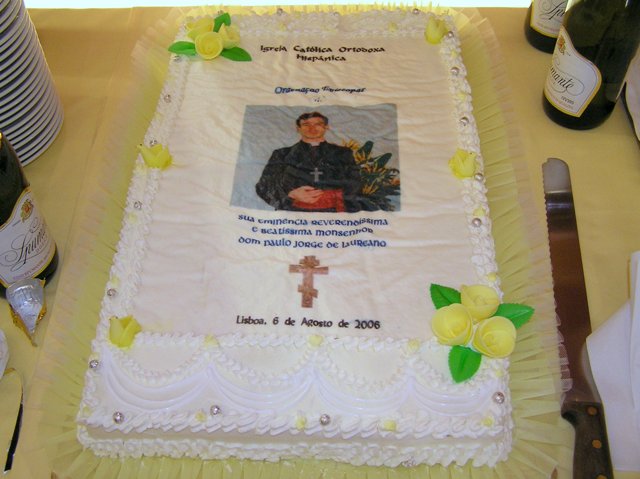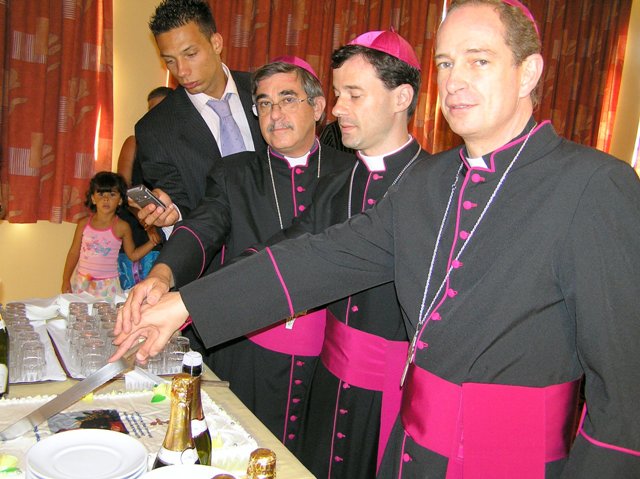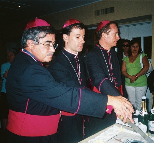 S.B. Dom Paulo Jorge de Laureano parte o bolo comemorativo da ocasião juntamente com os seus Bispos Sagrantes