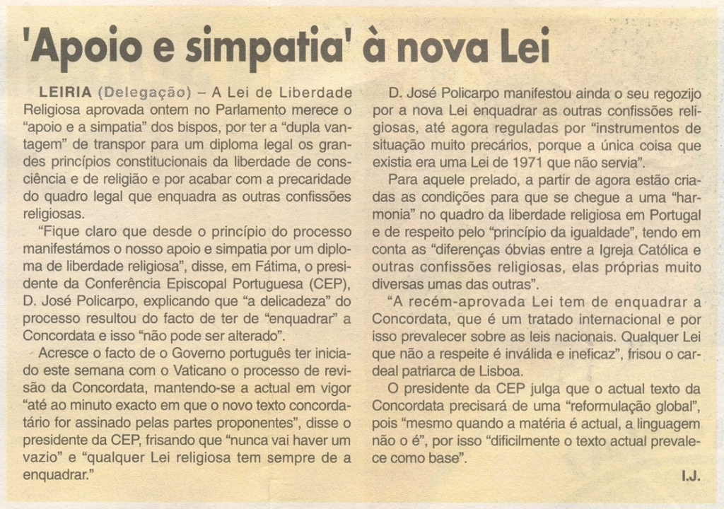Igreja Católica diz não à lei da liberdade religiosa - 11 de Abril de 2001