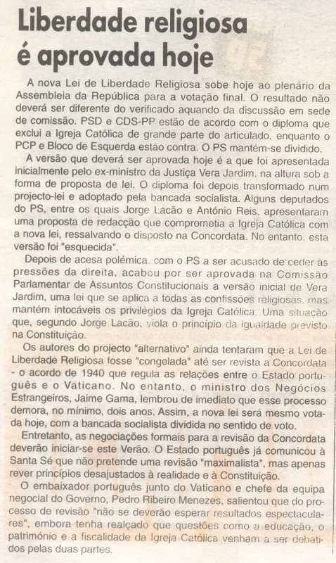 Liberdade religiosa é aprovada hoje - 26 de Abril de 2001