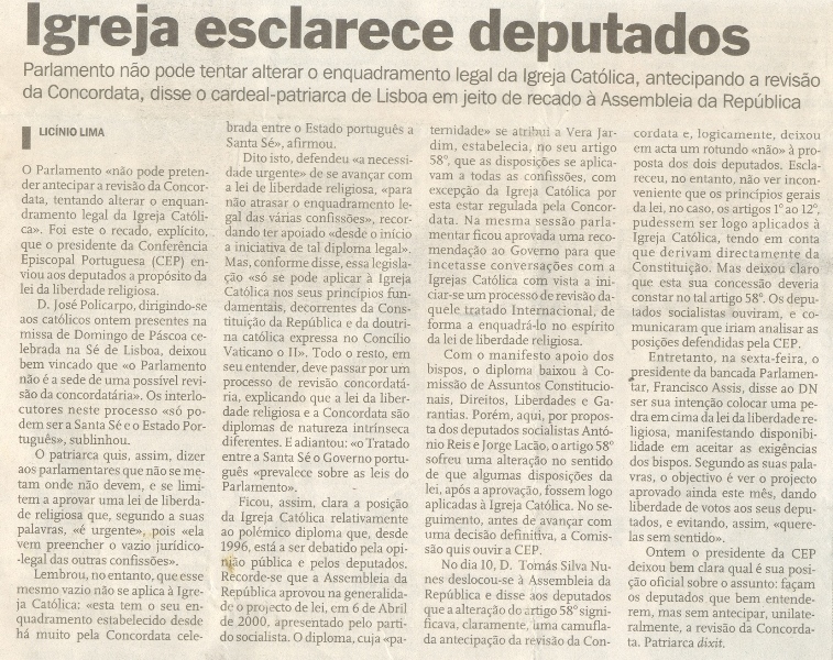 Patriarca de Lisboa apoia lei da liberdade religiosa - 16 de Abril de 2001