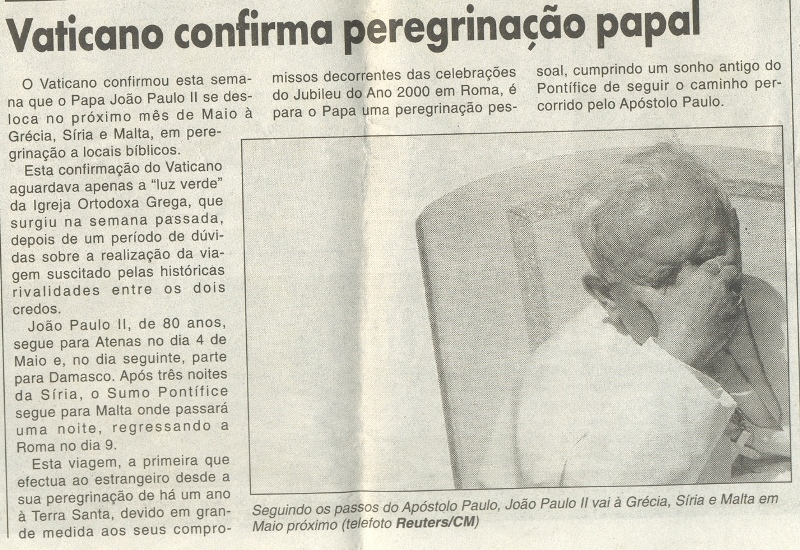 Vaticano confirma peregrinação papal - 29 de Março de 2001