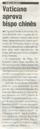 Vaticano aprova bispo chinês - 08 de Maio de 2006